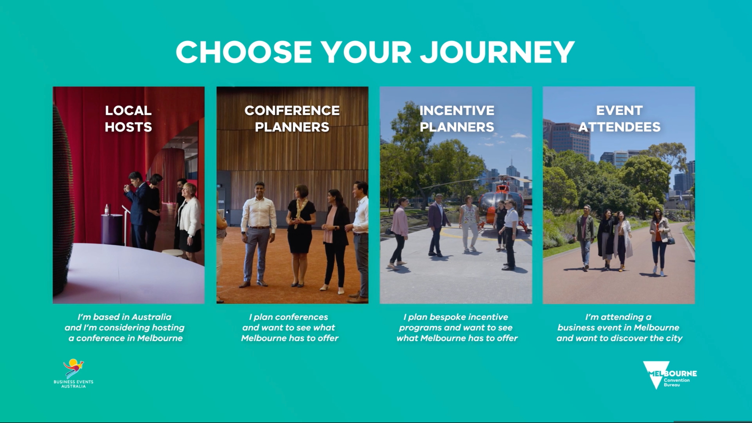 Melbourne Convention Bureau use video as part of their strategy to highlight the countless destinations and experiences Melbourne has to offer. In order to keep their marketing and advertising fresh, they wanted to incorporate interactivity into their 'Ready. Set. Melbourne' campaign, which was designed to reach four audiences: local hosts, conference planners, incentive planners and event attendees.